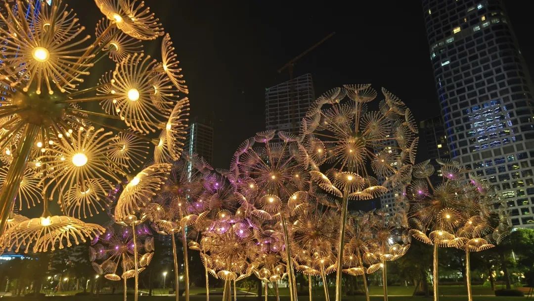 在橫琴金融島中央公園,40支高度為2.5米、直徑為0.6米的蒲公英燈飾如同希望的使者,散發(fā)著明亮而溫暖的光芒,為夜幕下的公園增添了一份璀璨的光彩。