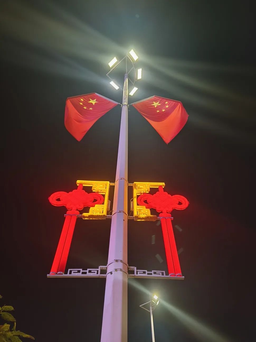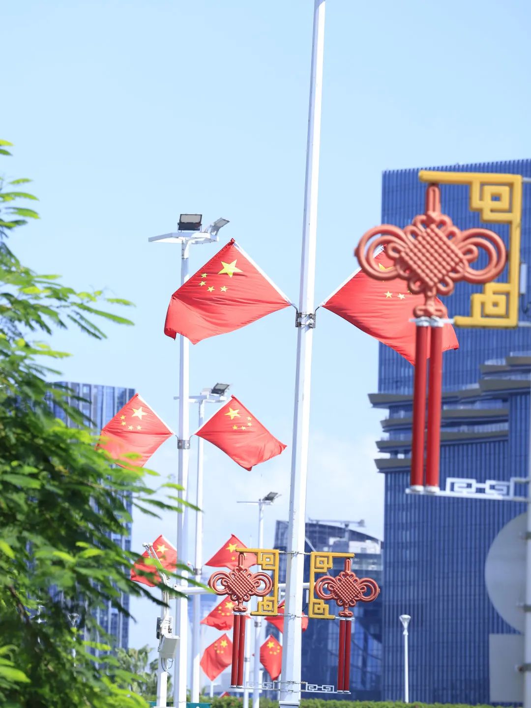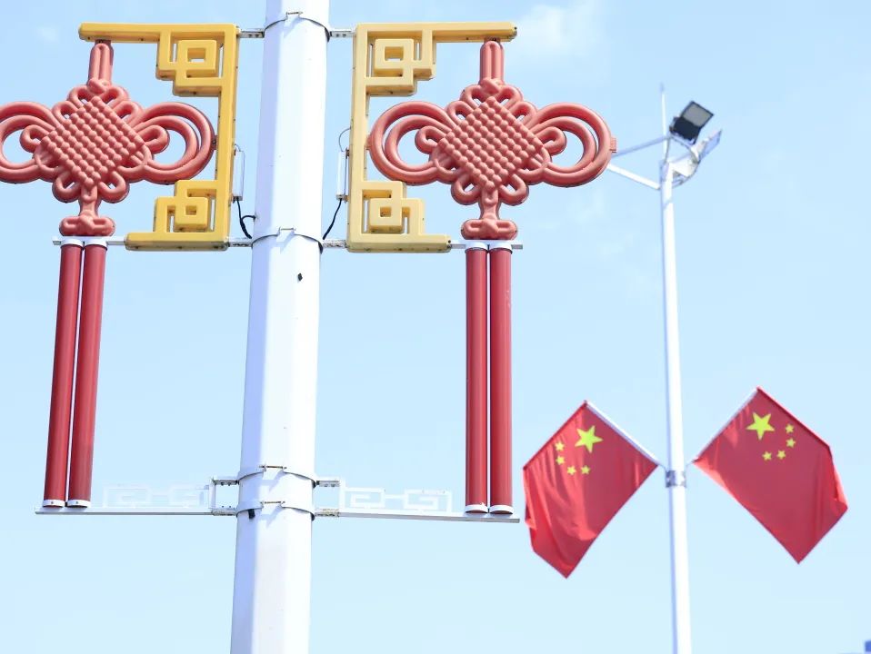 喜慶的中國結(jié)與迎風(fēng)飄揚的五星紅旗交相輝映