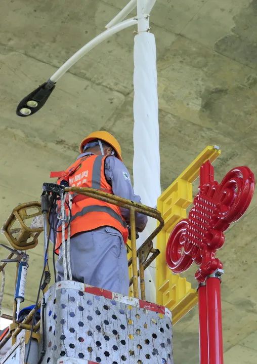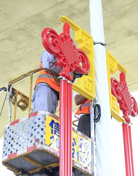 作業(yè)人員在各主干道懸掛中國結(jié)