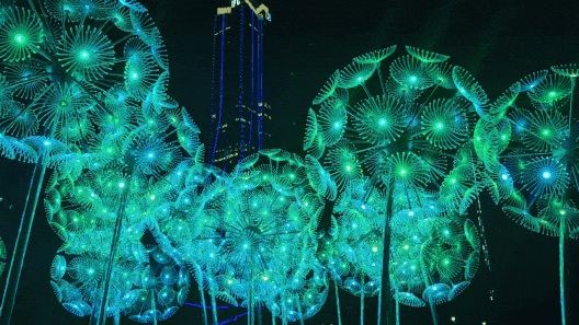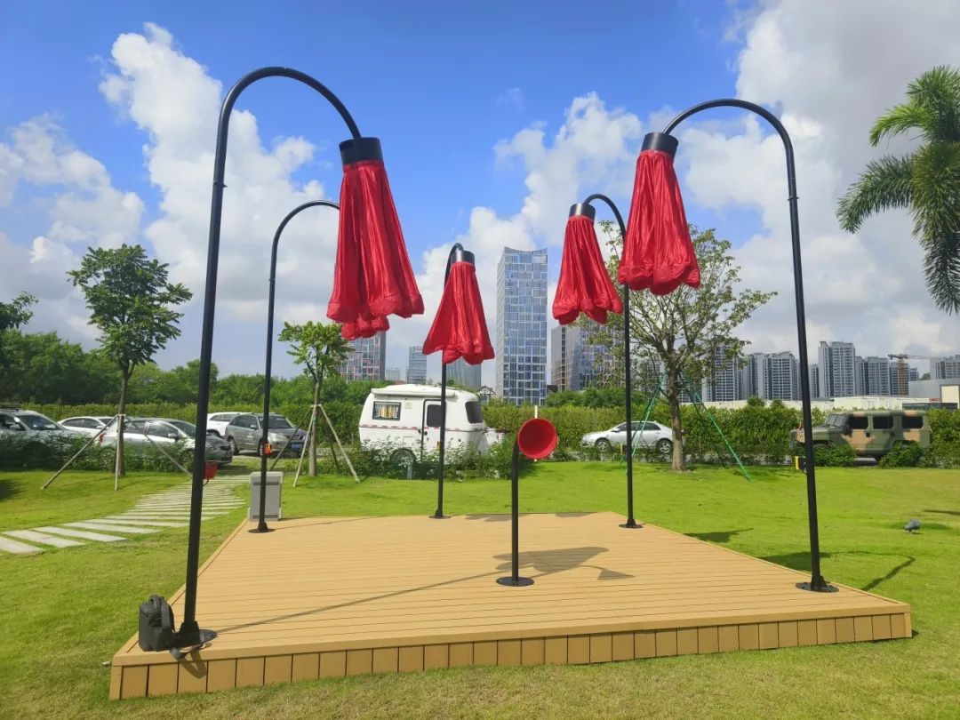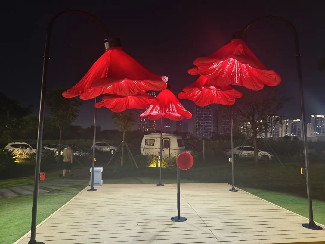 橫琴生態(tài)澤園的創(chuàng)意燈飾以含苞待放的喇叭花為主體造型,花朵使用充氣物料制成,內(nèi)部藏有感應(yīng)器。