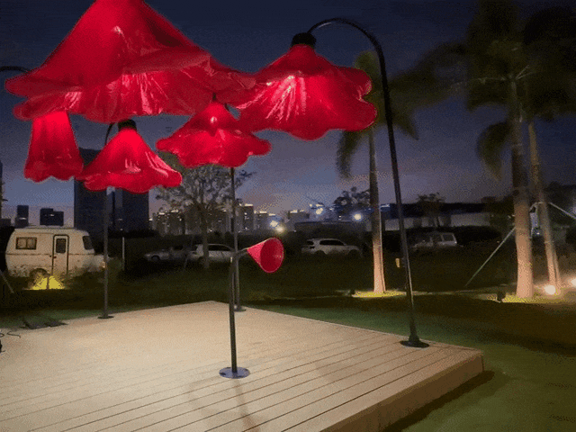 夜晚,當(dāng)游人經(jīng)過,在喇叭裝置處說出“熱烈慶祝中華人民共和國成立75周年”、“熱烈慶祝澳門回歸祖國25周年”等祝福語時,花朵會自動打開并亮燈,創(chuàng)造出驚喜的互動體驗。